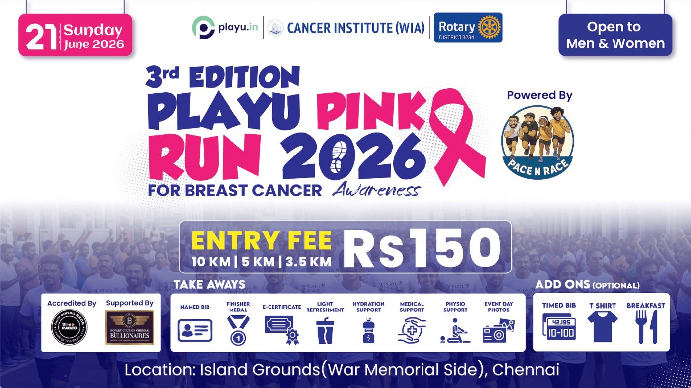 At playu.in, we are organizing the 3rd edition of the “ PLAYU PINK RUN 2026 Powered By Pace N Race , a Breast Cancer Awareness Run, on June 21, 2026, at Island Grounds, Chennai, in association with the Adyar Cancer Institute. This is a non-profit, awareness and fundraising initiative for the Cancer Institute. Last year, we successfully hosted the 2nd edition with 2,000+ runners and contributed ₹1,00,000 to the Cancer Institute. This year, our pledge is to contribute a minimum of ₹2,00,000 towards the cause. The event is supported by Rotary Club of Bullionaire's