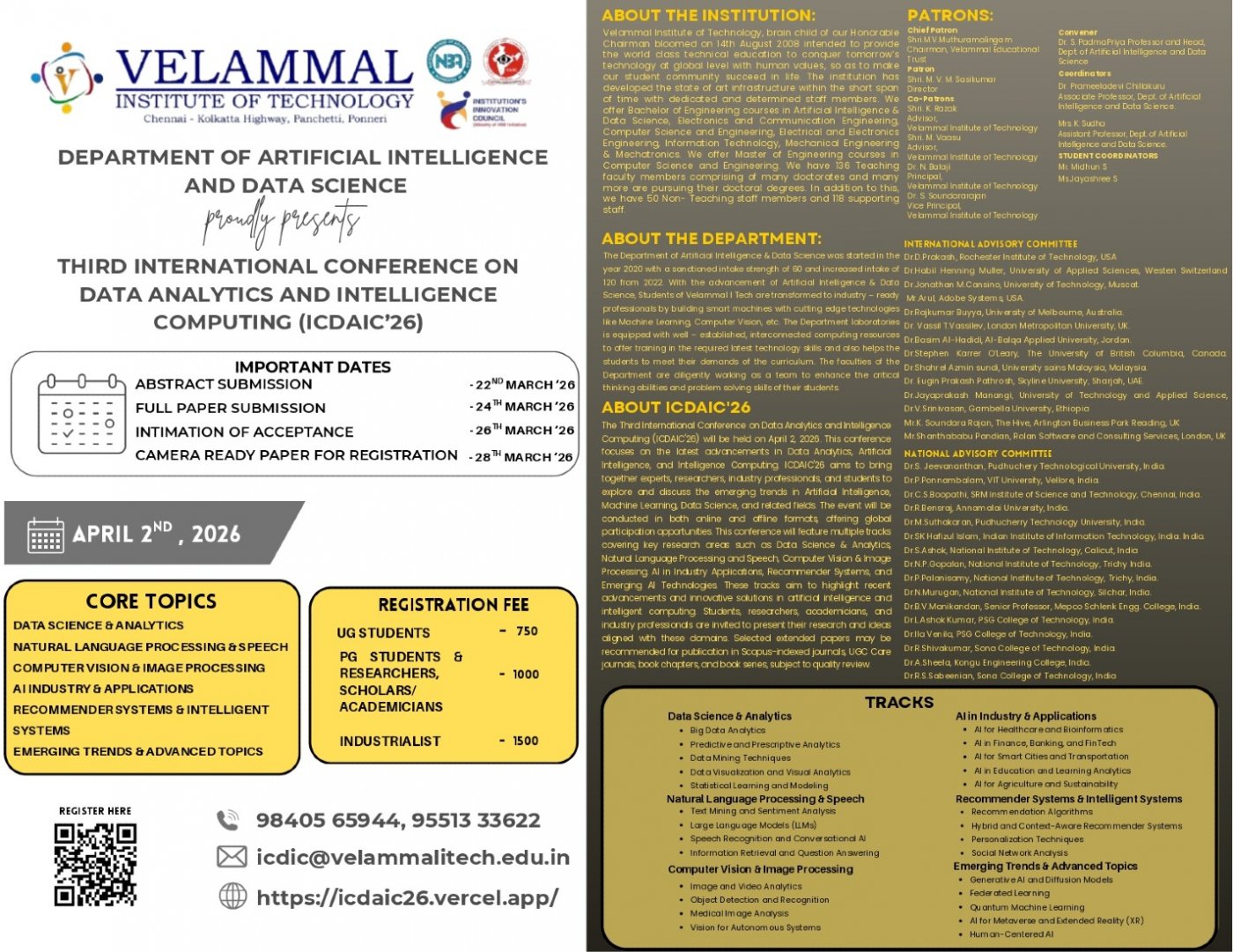 We are pleased to invite you to participate in the 3rd International Conference on Data Analytics and Intelligence Computing (ICDAIC'26) organized by the Department of Artificial Intelligence and Data Science, Velammal Institute of Technology, Chennai.