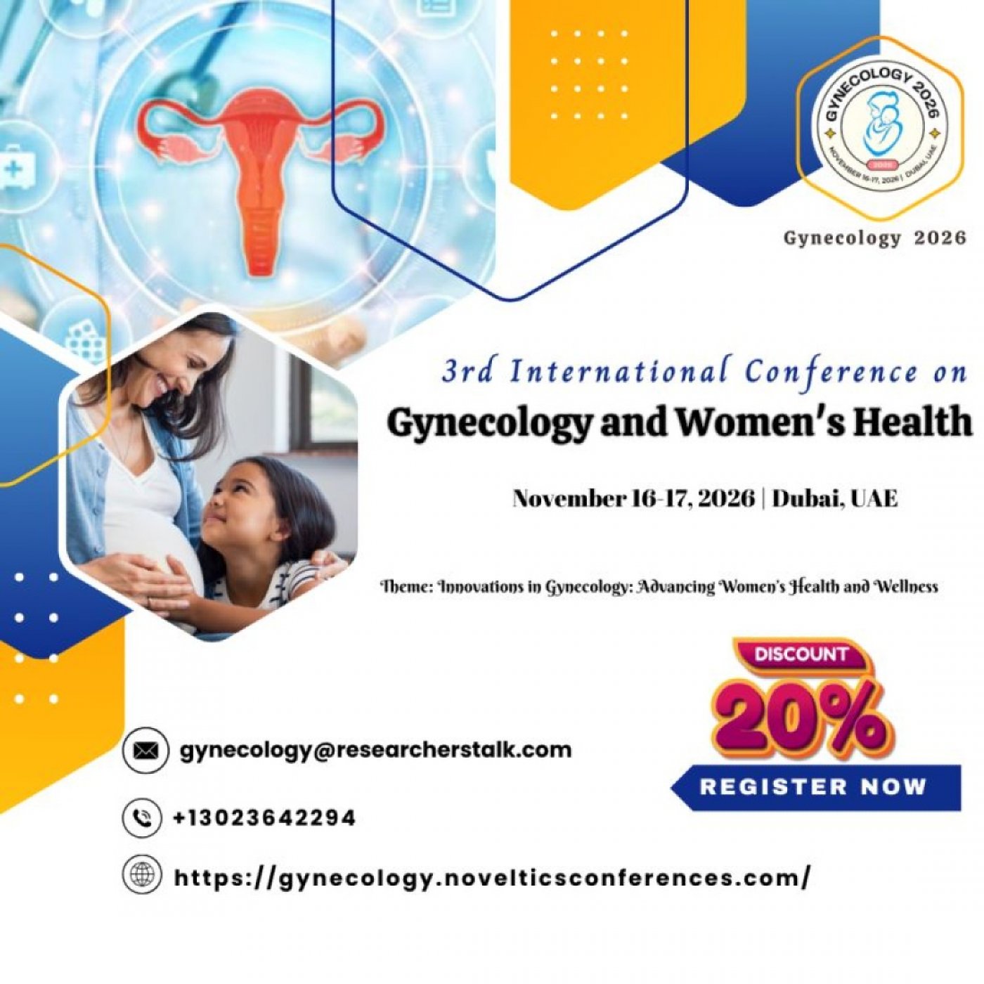 The "3rd International Conference on Gynecology and Women's Health" in Dubai, UAE, scheduled for November 16-17, 2026, is a prestigious event aimed at fostering collaboration, sharing knowledge, and promoting advancements in the field of women's healthcare. This conference brings together healthcare professionals, researchers, academics, industry experts, and policymakers from around the world to discuss the latest developments, challenges, and solutions in gynecology and women's health.