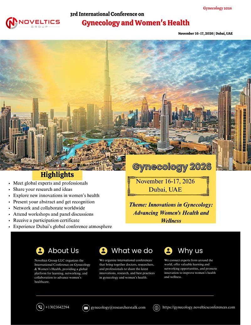 The "3rd International Conference on Gynecology and Women's Health" in Dubai, UAE, scheduled for November 16-17, 2026, is a prestigious event aimed at fostering collaboration, sharing knowledge, and promoting advancements in the field of women's healthcare. This conference brings together healthcare professionals, researchers, academics, industry experts, and policymakers from around the world to discuss the latest developments, challenges, and solutions in gynecology and women's health.