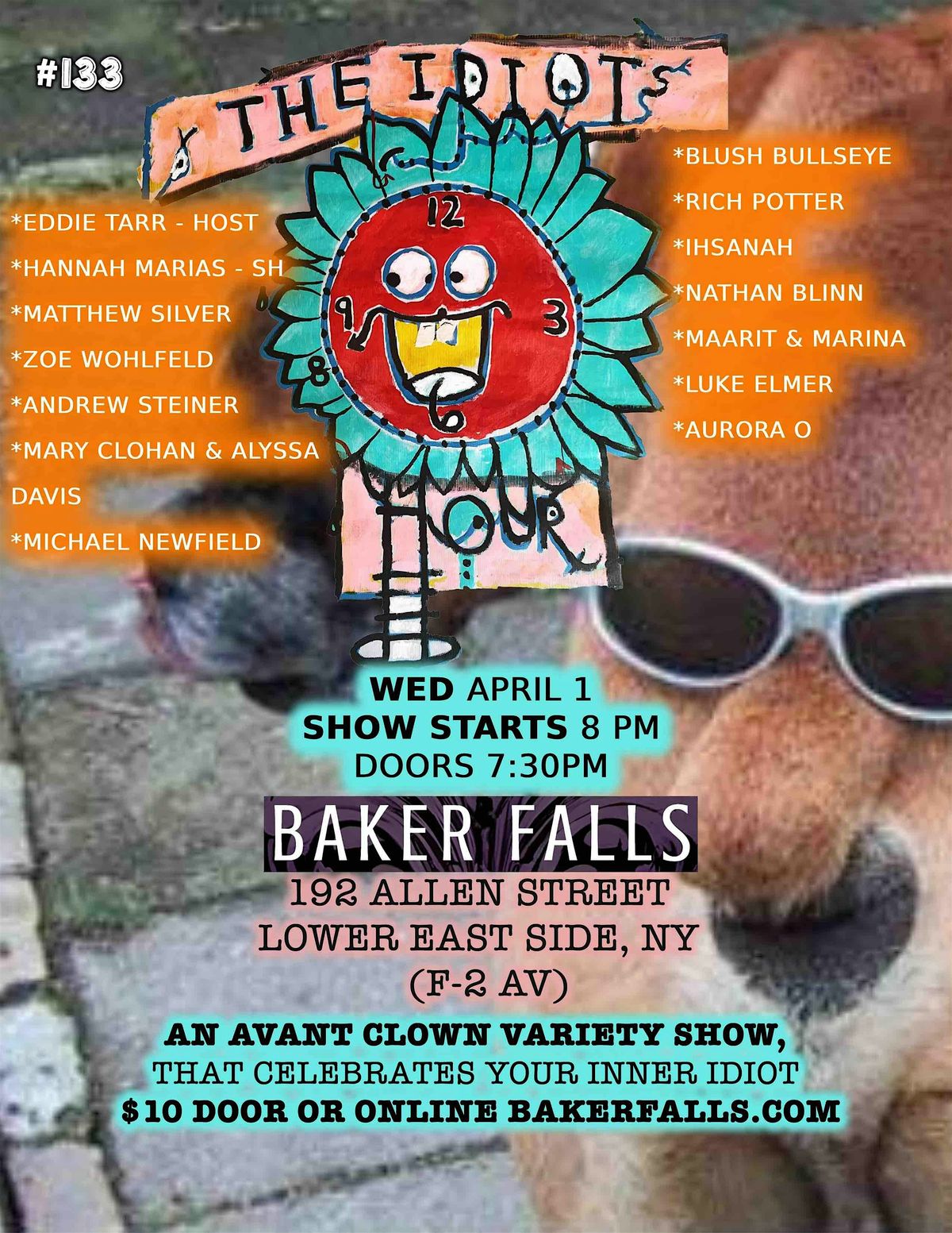 A two-hour Avant-Clown variety show celebrating your Inner Idiot! Featuring 10–12 clown performances—with a 15 min. intermission. Happening at Baker Falls in the Lower East Side.