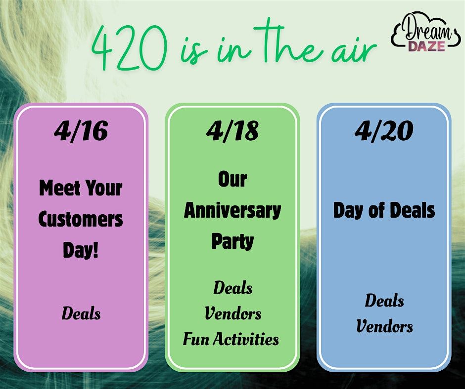 Join us at Dream Daze Dispensary on May 11, 2026 at 10:00 AM (Eastern Time) for a chill week of celebrating the 4/20 vibe! Expect good vibes, cool people, and plenty of fun throughout the week. Whether you're a longtime fan or just curious, come hang out and enjoy the atmosphere. Don’t miss out on the week-long festivities!