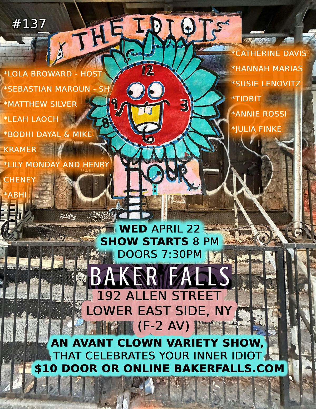 A two-hour Avant-Clown variety show celebrating your Inner Idiot! Featuring 10–12 clown performances—with a 15 min. intermission. Happening at Baker Falls in the Lower East Side.