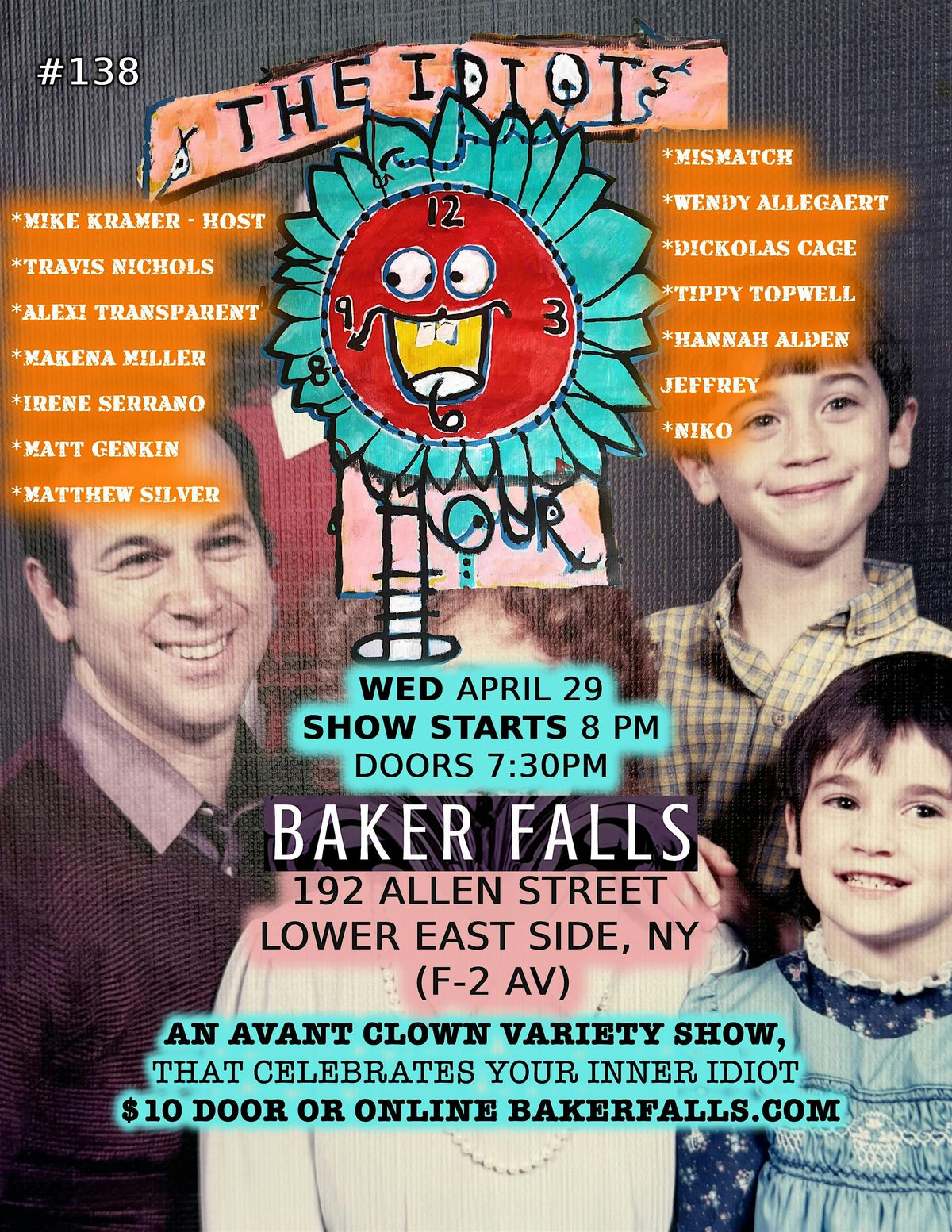 A two-hour Avant-Clown variety show celebrating your Inner Idiot! Featuring 10–12 clown performances—with a 15 min. intermission. Happening at Baker Falls in the Lower East Side.