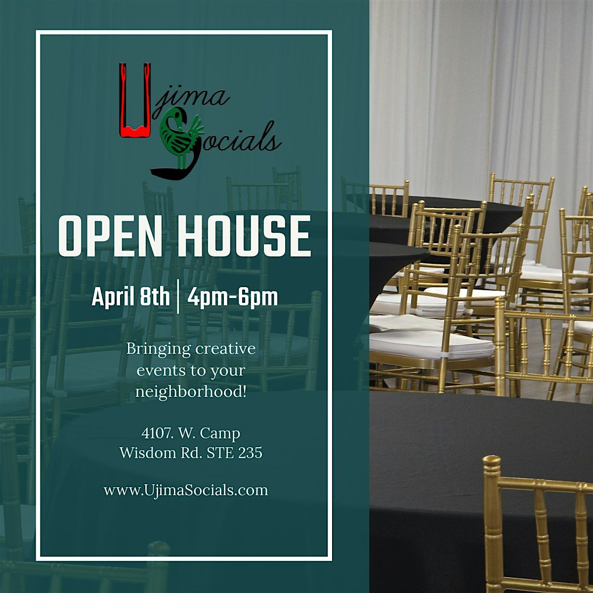 Stop by anytime between 4 pm -6 pm at 4107 W. Camp Wisdom to check out our event space. RSVP is suggested, but not required. See the table, chair and add on options. Visualize your event and ask any questions in person. These events are held often to give you flexibility in your planning. Hope to see you there.