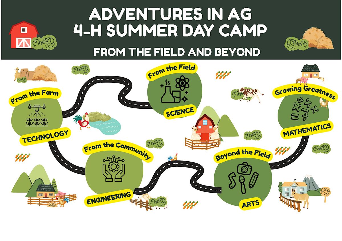 Adventures in Ag: From the Field and Beyond 4-H Day Camp invites youth to dig deeper into the world of STEAM through agriculture. Campers will explore, create, experiment, and discover through hands-on activities, fun games, demonstrations, delicious snacks, and an off-site adventure. The week wraps up with a lively “Share Fair,” where campers proudly share their discoveries with parents and friends.