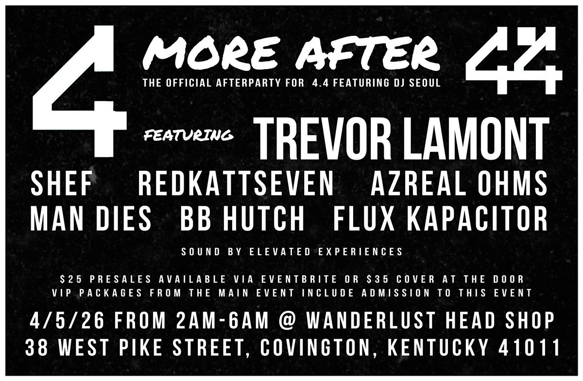 Join us for four additional hours of techno following 4.4, featuring headliner DJ Seoul! The party runs from 2 AM to 6 AM at Wunderlust Head Shop in Covington, just a short walk from the main event at Madison Live.
