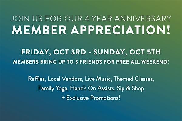 Join us at YogaSix Santa Rosa for a special event filled with yoga, community, and fun. We are so grateful for your support over the past four years, and we want to celebrate with you! Whether you're a seasoned yogi or brand new to the practice, this event is for everyone. Expect a weekend of themed classes like Glow Flow, Family, Candlelight, Live Music, Sound Baths, Hands on Assists, amazing raffle prizes and exclusive promotions. Let's flow, connect, and commemorate this milestone together. See you there!