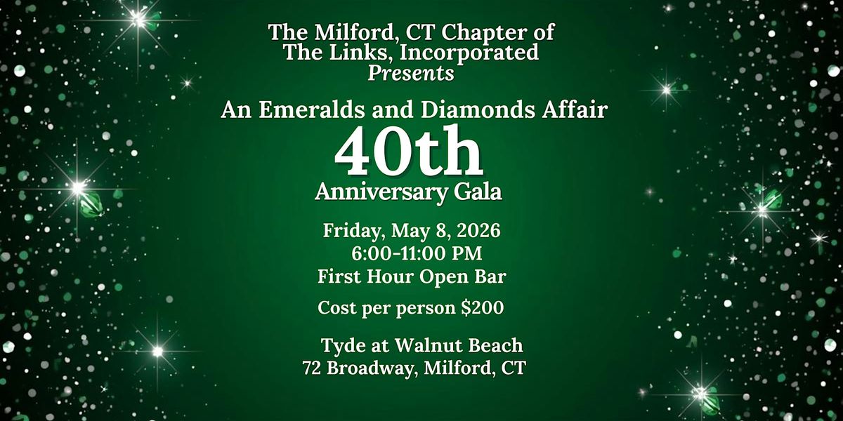 Get ready for an unforgettable night at Tyde at Walnut Beach! Join us on May 8, 2026 at 6:00 PM EDT for a dazzling evening full of elegance and fun. Dress to impress in your finest black-tie attire and celebrate this special 40th anniversary with sparkling emeralds and diamonds vibes. It’s the perfect chance to mingle, dance, and make memories.