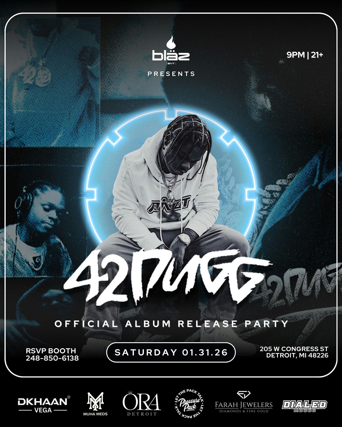Join us for the official album release party for 42 Dugg’s new project “Part 3”! Presented by Bläz at Ora Detroit (205 W Congress St, Detroit, MI 48226). The Detroit hip-hop star will be hosting and performing exclusive tracks from his latest album. Expect an unforgettable night featuring special guest from Detroit’s most influential scenes, with music by DJ Babyvaye (Toronto) and Detroit’s top local DJs. Special thanks to our sponsors: Muha Meds, Dkhaan Vega, Dialed Moods, Farah Jewelers & Pressure Pack. Doors open at 9PM. 21+ event. RSVP for booth reservations at 248-850-6138