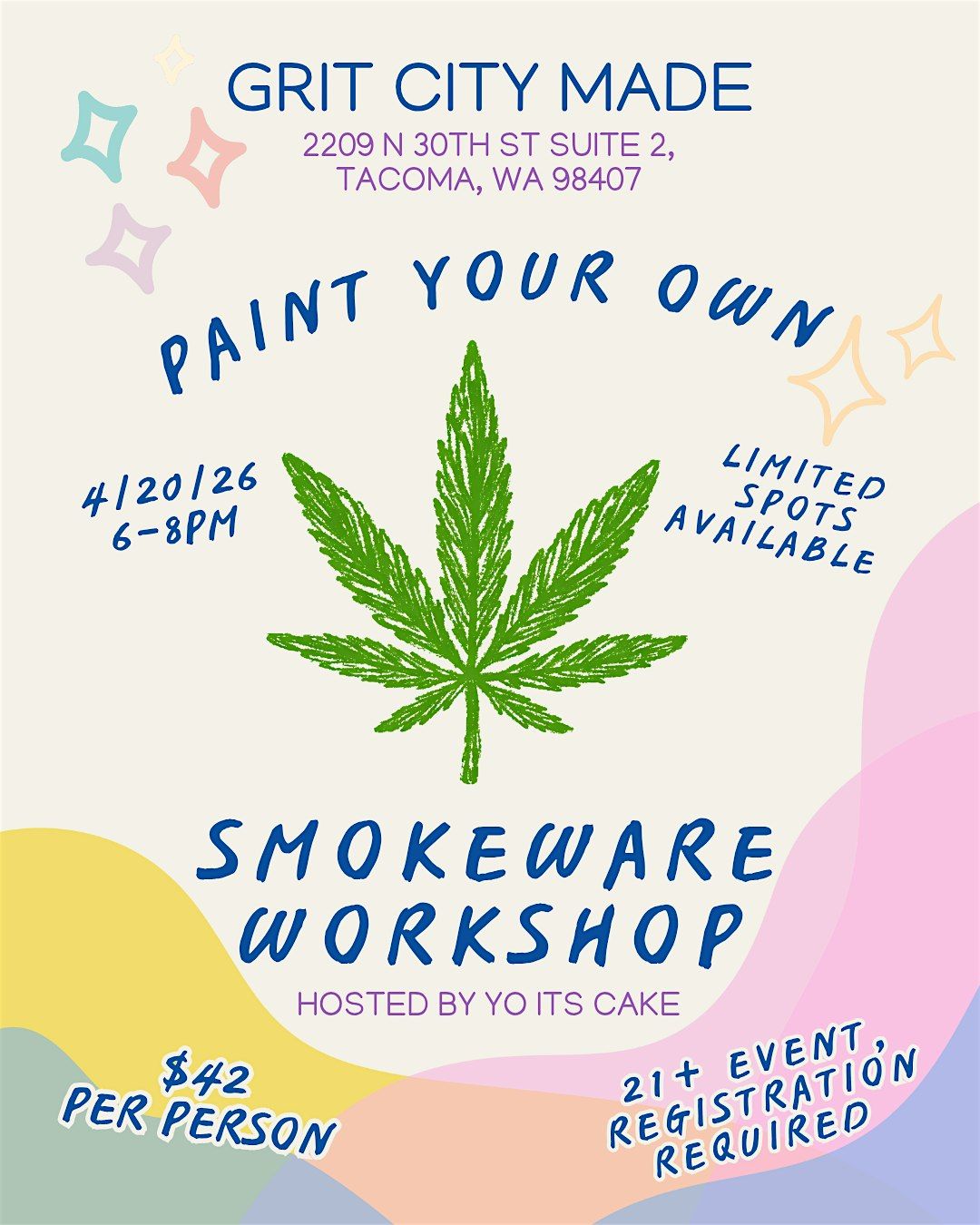 Get ready to unleash your creativity and paint your very own smoke ware with Yo Its Cake! Join us at Grit City Made on April 20, 2026 at 6:00 PM (Pacific Time) for a chill, hands-on session where you can make something truly unique. Whether you're a pro or just wanna have fun, this is the perfect way to celebrate 420 with good vibes and cool art. Don’t miss out!
