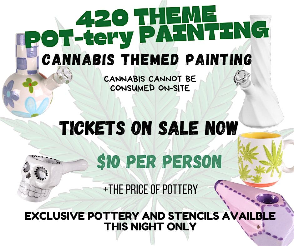 Come join us for a chill in-person session of 420 POT-tery Painting! Whether you’re a pro or just wanna have fun, grab a brush and create some custom on of a kind paraphanilla, l. It's all about good vibes, creativity, and hanging out with friends. Don’t miss out on this unique way to unwind and express yourself. Bring your best mood and let's get painting! CANNABIS CANNOT BE CONSUMED ON SITE! MUST BE 21!