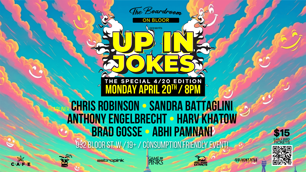 Join us for “420 Up in Jokes,” a 420-friendly stand-up comedy show in Toronto featuring an all-star lineup: Chris Robinson, Sandra Battaglini, Anthony Engelbrecht, Harv Khatow, Brad Gosse, and Abhi Pamnani bringing high-energy laughs, good vibes, and blazing-hot jokes all night.