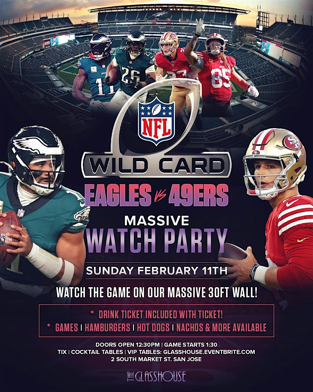 49ERS vs EAGLES WATCH PARTY! SUNDAY @THE GLASSHOUSE! 1PM! PLAYOFFS