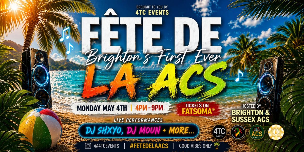 Get ready for Brighton’s first-ever Fête De La ACS — the ultimate Day Party experience brought to you by 4TC Events! Join the vibes on Monday, May 4th, from 4 PM to 9 PM, with live sets from DJ Shxyo, DJ Moun, and more. Hosted by Brighton & Sussex ACS, this event promises good music. #FeteDeLaACS 🌴🎶.