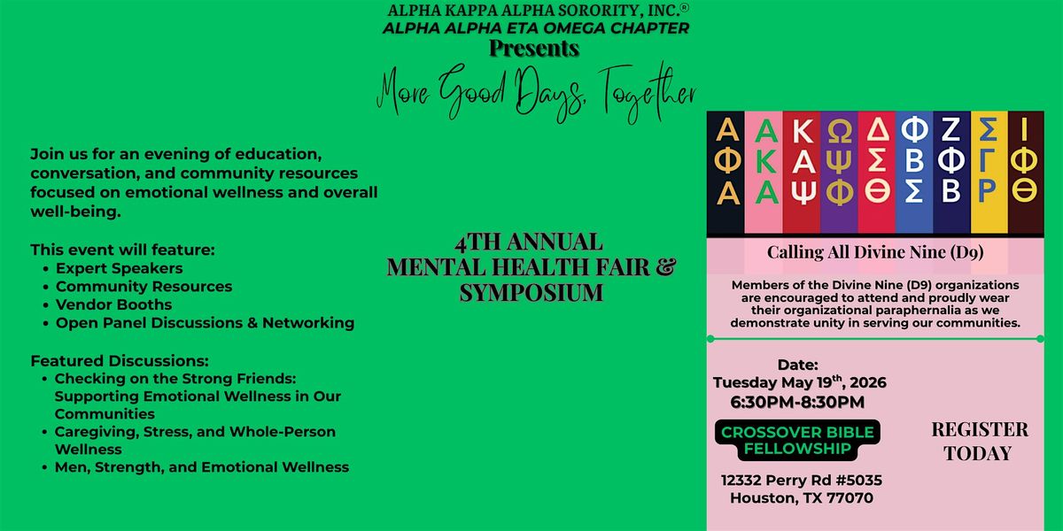 Join us at Crossover Bible Fellowship on Tuesday, May 19, 2026 at 6:30p for an evening of education and empowerment. This event is all about raising awareness and sharing support for mental health in our community, for us and our loved ones.