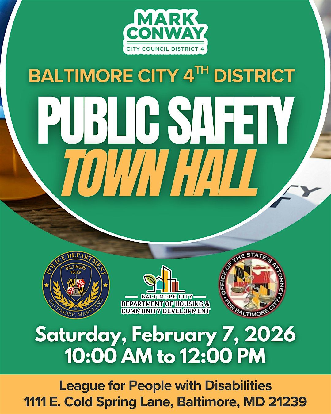 Join me on Saturday, February 7th, from 10:00 AM – 12:00 PM for our Community Public Safety Town Hall at the League for People with Disabilities, located at 1111 Cold Spring Lane, Baltimore, MD. This is an opportunity to come together, raise concerns, hear updates, and work collectively toward a safer 4th District.