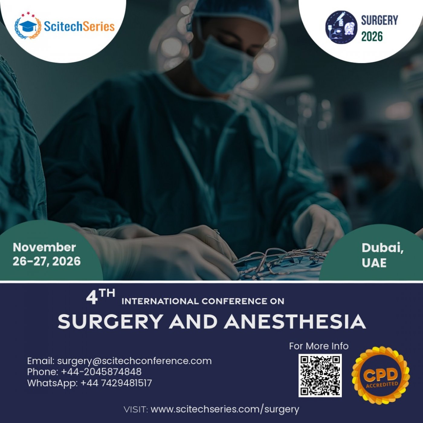 We are delighted to extend a cordial invitation to the “4th International Conference on Surgery and Anesthesia” (Surgery 2026) scheduled as a Hybrid Event during November 26-27 2026 in Dubai UAE.This conference is focusing on the theme “Explore multidisciplinary approaches advancements in surgery and anesthesia.”