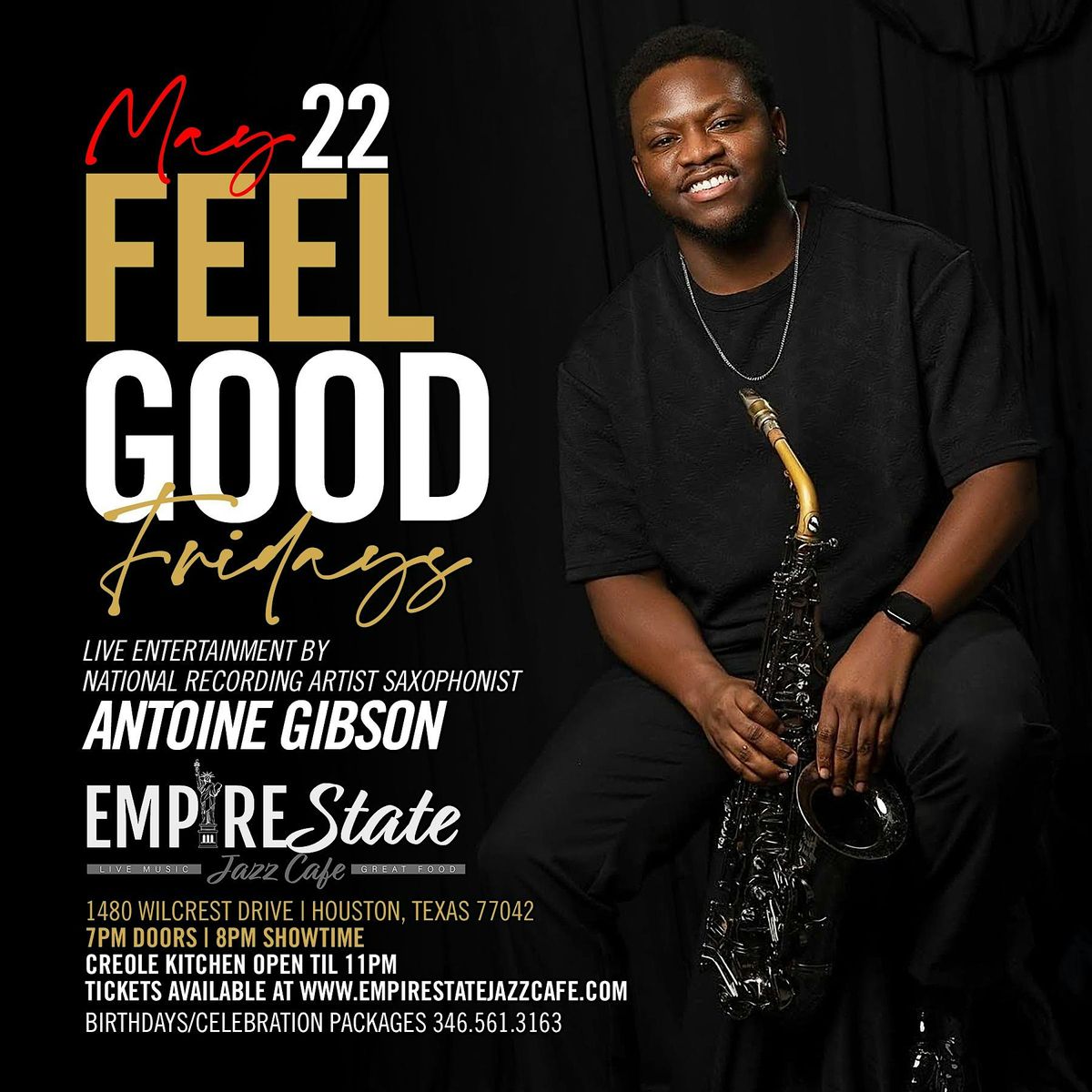 Welcome to the Empire State Jazz Cafe for an unforgettable night with 5/22 - National Recording Artist Saxophonist Antoine Gibson Friday! Get ready to be blown away by the incredible talent of Antoine Gibson on March 22, 2026 at Doors 7:00 PM | Showtime 8:00 PM (Central Time). Join us for an evening filled with smooth jazz melodies and soulful tunes. Don't miss out on this amazing opportunity to experience live music at its finest. See you there!