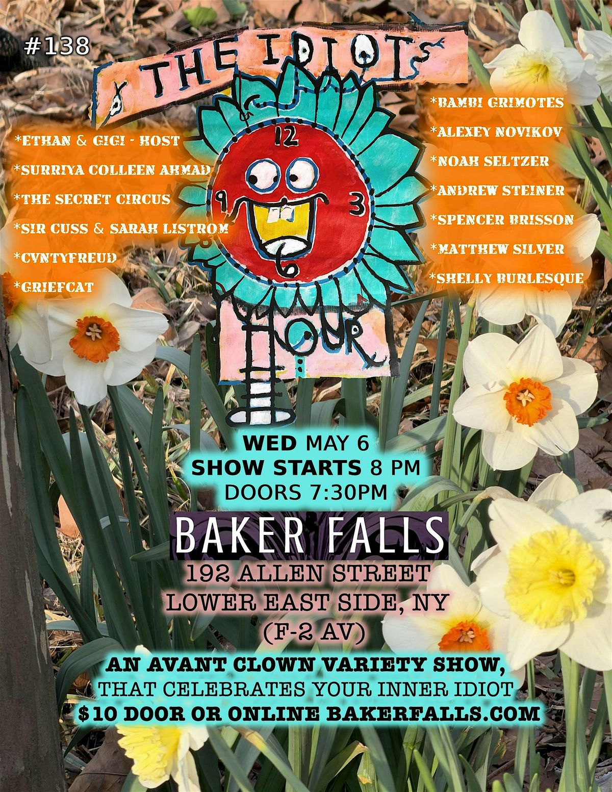 A two-hour Avant-Clown variety show celebrating your Inner Idiot! Featuring 10–12 clown performances—with a 15 min. intermission. Happening at Baker Falls in the Lower East Side.