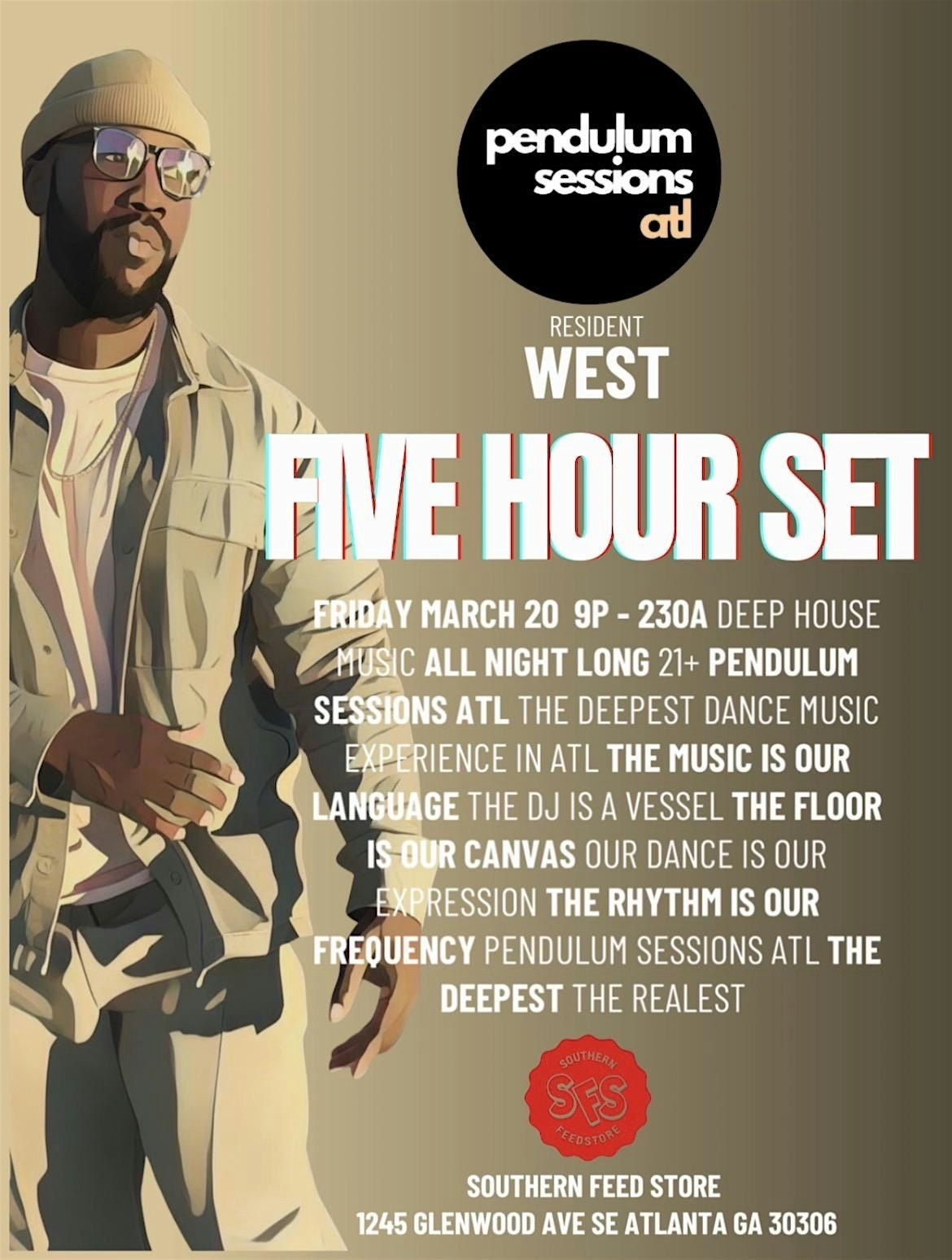 ATL based DJ + Producer WEST returns to Southern Feed Store in EAV for his monthly residency @ Pendulum Sessions ATL. 5 Hour Deep House Set