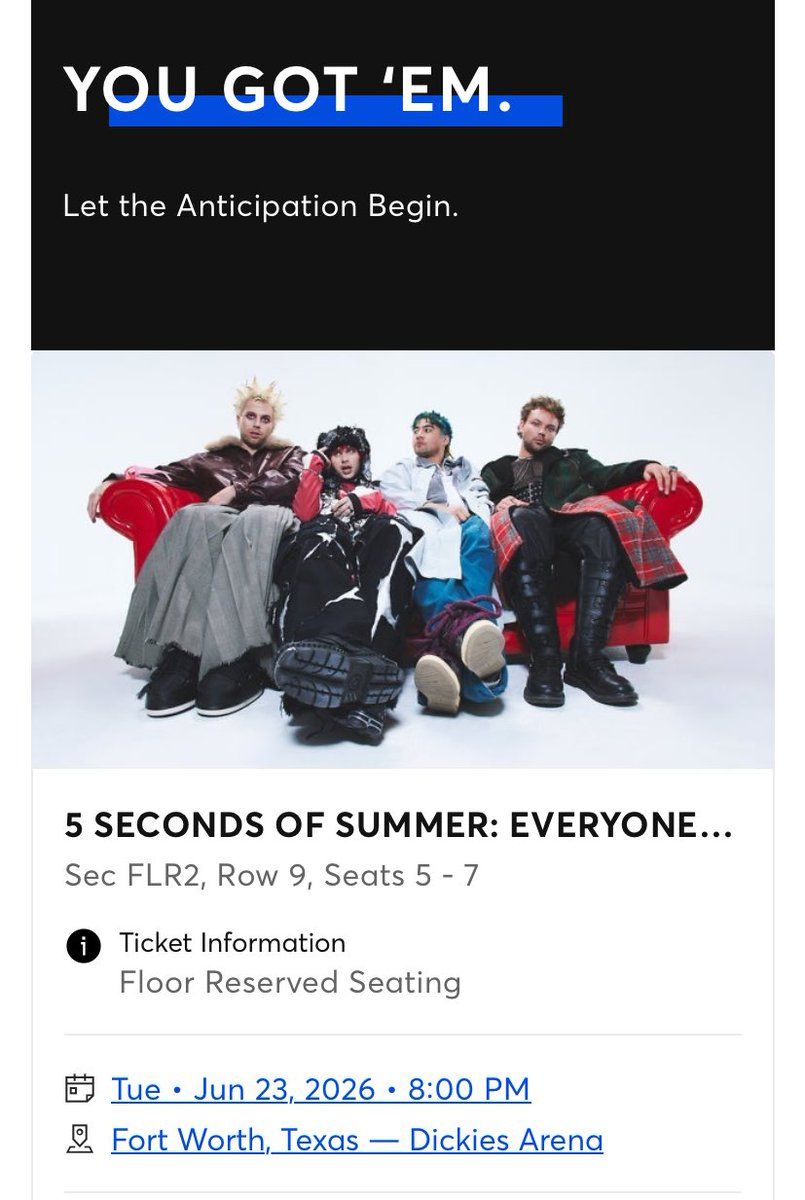 5 Seconds of Summer at Dickies Arena🎉 Welcome to 5 Seconds of Summer Fort Worth Tickets, where dreams come alive and possibilities are endless! 🏛️ Join us at Dickies Arena in the heart of Fort Worth, TX for an event that defies expectations. 📅 On June 23rd, 2026 at 08:00 PM, be part of something truly extraordinary as we bring together innovation, entertainment, and pure magic. ✨ Every aspect has been carefully designed to ensure an unforgettable experience for all our guests. Whether you're seeking adventure, inspiration, or simply a break from the ordinary, this event promises to deliver beyond your wildest dreams. 🎟️ Tickets are available at 45.08 EUR. 🎊 Prepare for a journey into the extraordinary!