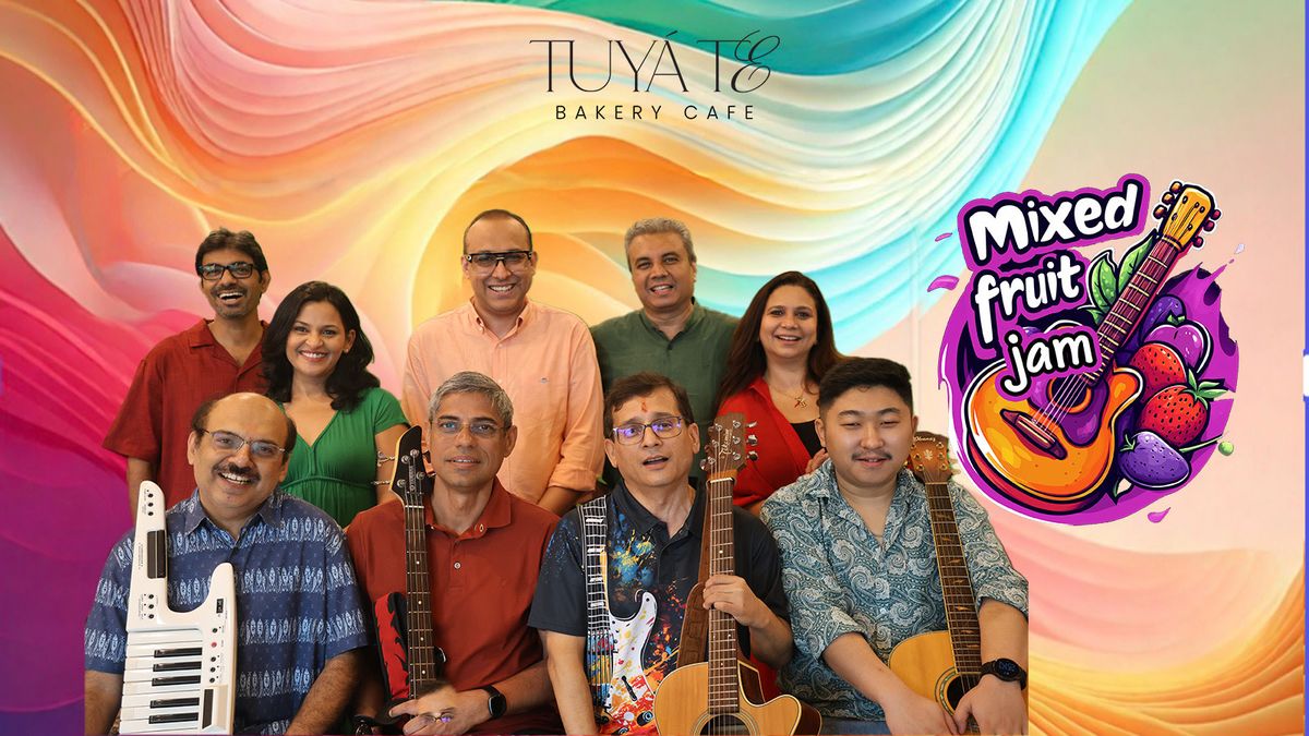 🎶 Mixed Fruit Jam – Live at Café Tuyate 🎶Nine passionate musicians, who once arrived in Gurgaon with nothing but their families, careers, and a shared love for music, discovered each other at a monthly jamming forum. What started as casual sessions soon blossomed into a powerful collaboration — Mixed Fruit Jam, a band that celebrates music in all its vibrant shades.The Mixed Fruit Jam experience is one of warmth, immersive exploration, and unfiltered passion. From grooving to energetic Bollywood beats, drifting away in soulful Sufi rhythms, to rocking out with timeless Western anthems — every performance is a journey that ignites the spirit and celebrates romance in its infinite colours.Now, this musical blend comes alive at the heart of Gurgaon — Café Tuyate. Join us for an unforgettable evening filled with rhythm, melody, and the joy of shared expression.Come for the music, stay for the vibe. 🎤🎸🥁