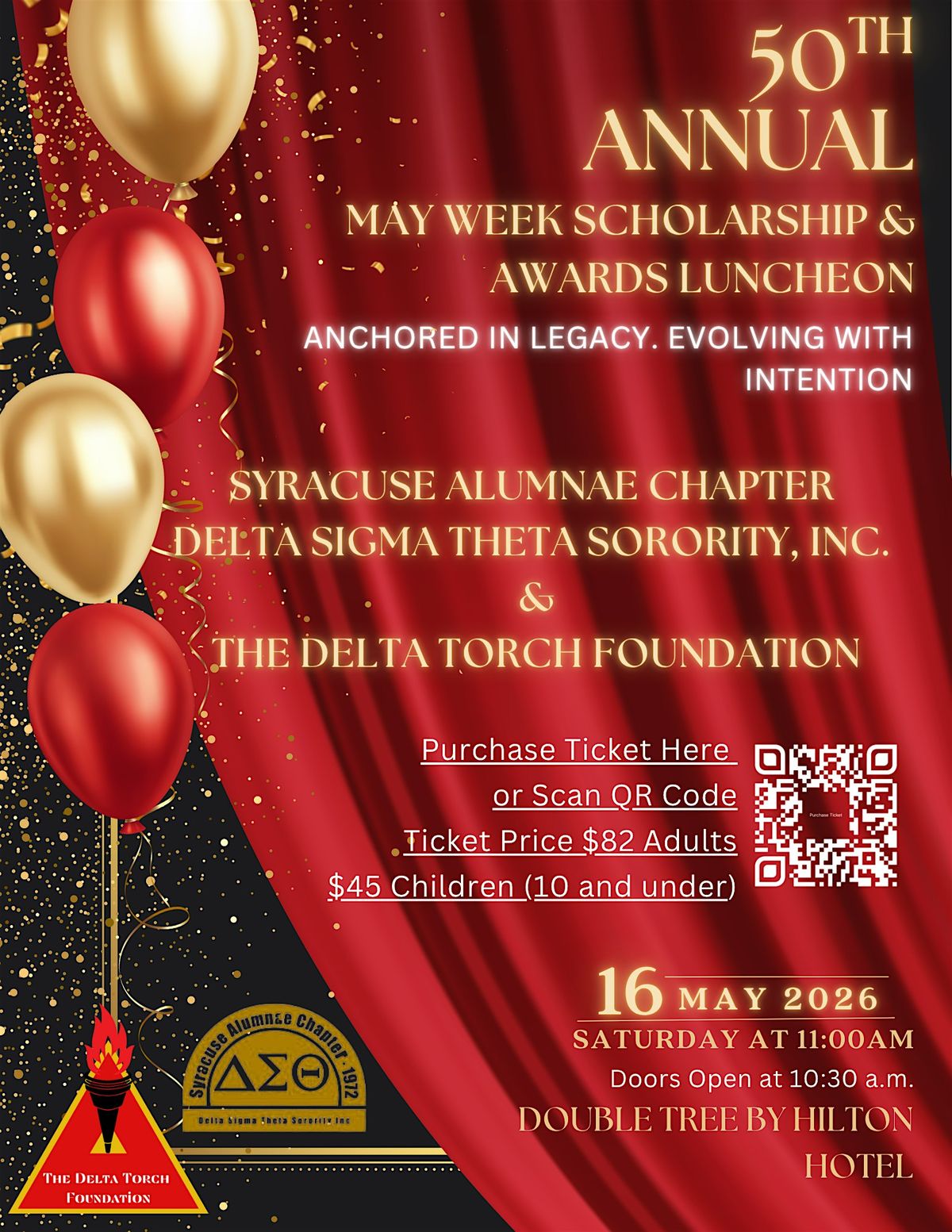 Welcome as we Celebrate our 50th Annual May Week Scholarship & Awards Luncheon, hosted by the Syracuse Alumnae Chapter of Delta Sigma Theta Sorority, Inc. and The Delta Torch Foundation. Join us on Saturday, May 16, 2026 at 11:00 AM (doors open at 10:30 AM) at the DoubleTree by Hilton Hotel Syracuse as we recognize the academic excellence of aspiring high school seniors with our scholarship awards, and individuals making an impact in our community with our Fortitude Award. This in-person event promises to be a memorable occasion filled with inspiration and fellowship. Don't miss out on this special occasion to recognize and celebrate excellence!