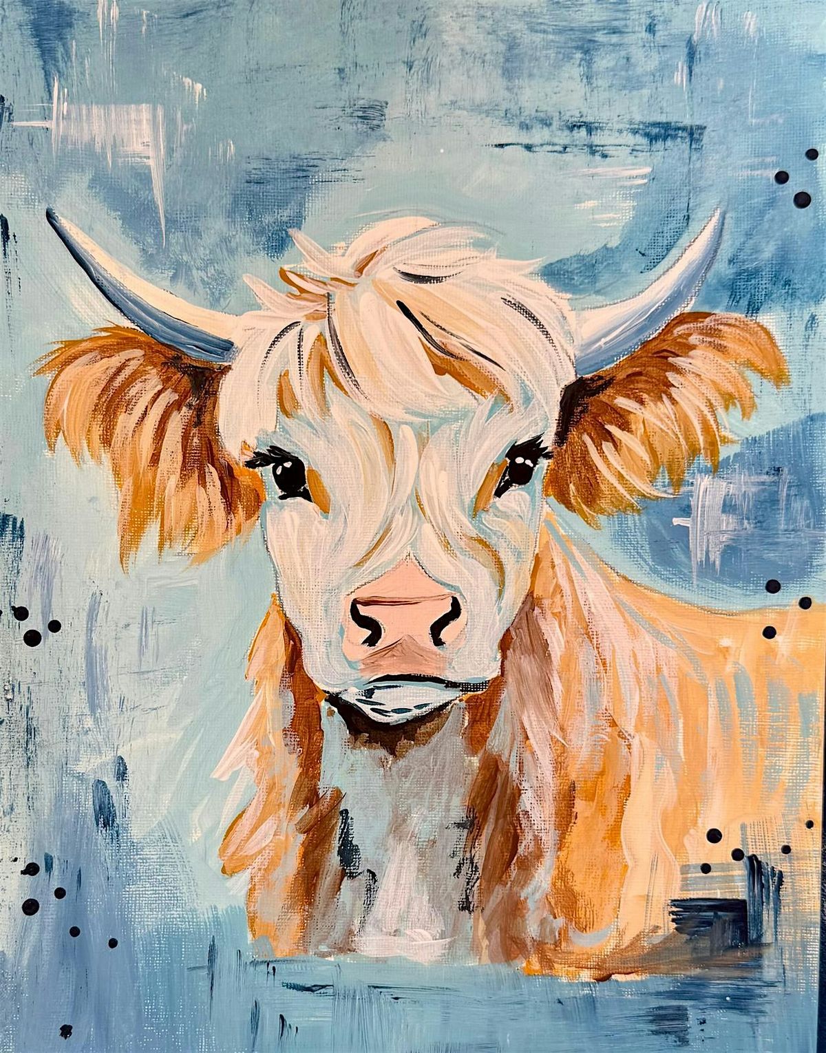 We’re painting this whimsical, shaggy-haired Highland Cow. Don't worry if you've never picked up a brush—we’ll guide you through every layer of that fluffy coat and those soulful eyes.