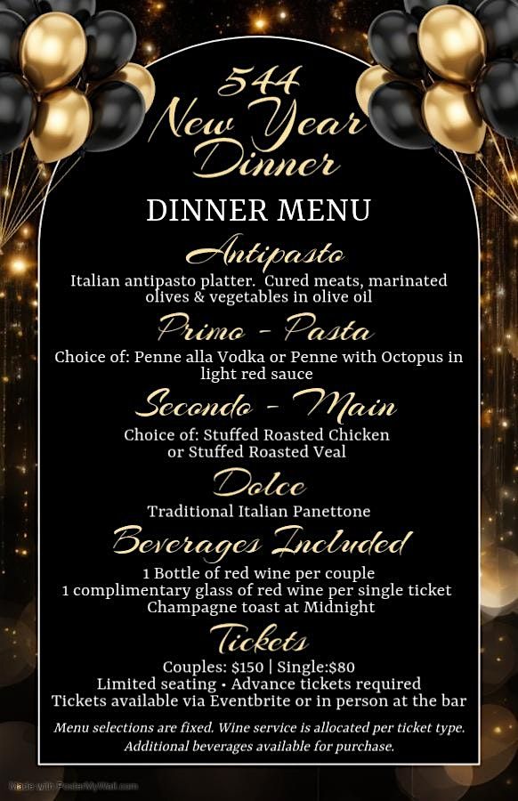 Ring in the New Year with an elegant Italian dinner experience. Your ticket includes a multi-course dinner featuring antipasto, pasta, main course, and traditional Italian dessert, plus wine service and a champagne toast at midnight.