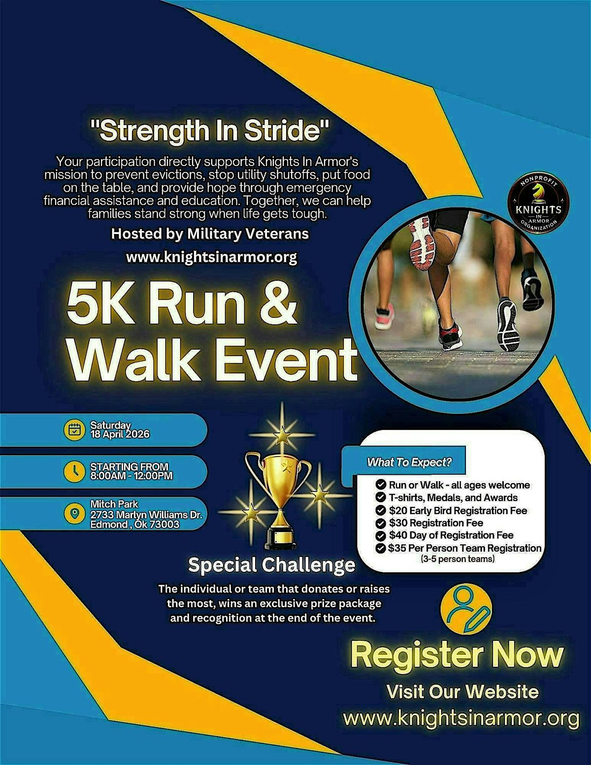 Info: Participants will be welcomed by Knights in Armor leadership with a brief overview of the organization's mission and the impact of the Strength in Stride 5K. Event details, safety reminders, and a moment of appreciation for runner, teams, sponsors, and volunteers will follow before the race begins.