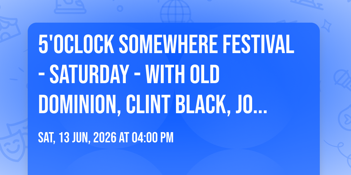 📍 Location: 26.7136, -80.04984✨ Experience the magic of 5'OClock Somewhere Festival - Saturday - with Old Dominion, Clint Black, John Anderson, and more, where moments become memories that last a lifetime! 🏛️ The iconic Waterfont Commons in West Palm Beach, FL sets the perfect stage for an unforgettable celebration on June 13th, 2026 at 04:00 PM. 🌟 It's been a curated experience that brings together the best of entertainment and innovation, creating an atmosphere of wonder and excitement. From the moment you arrive, you'll be immersed in a world where the ordinary transforms into the extraordinary. 🎊 Book early to secure your place in what promises to be an event that will be talked about for years to come!