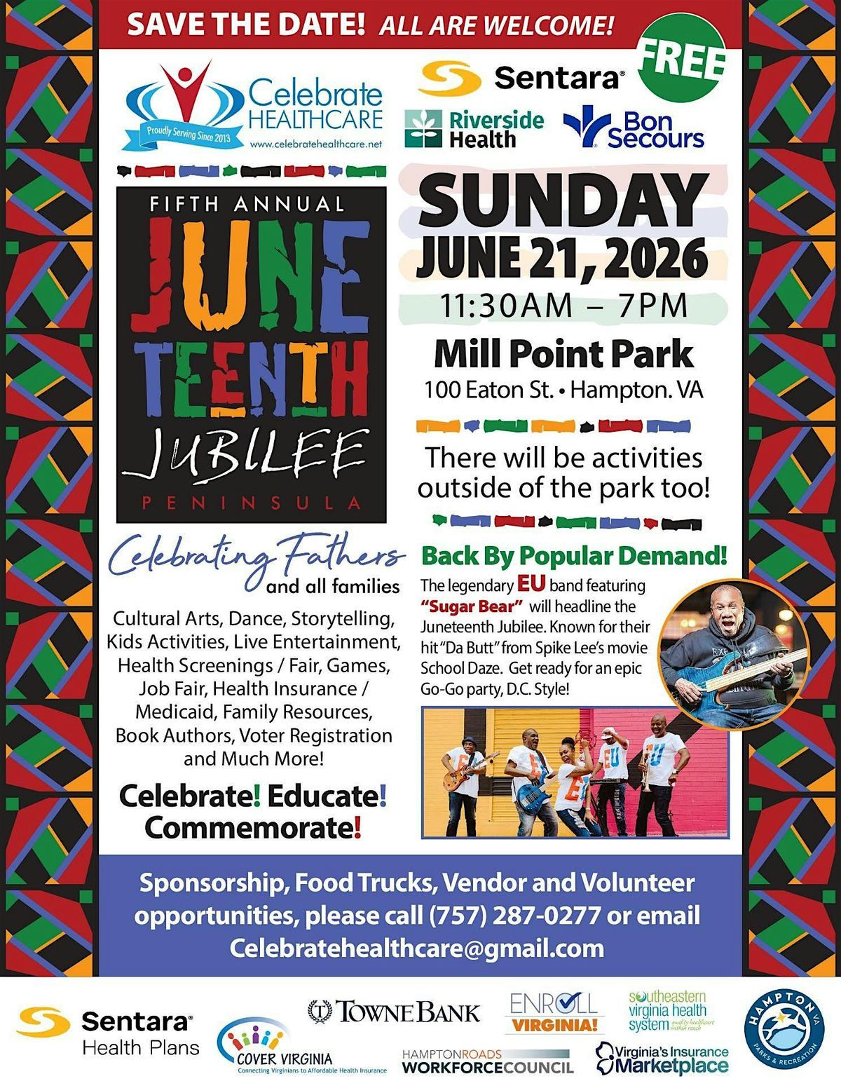 Health Screenings, Live entertainment , Community Resources, Vendors, Activities and more! Back by Popular Demand the Legendary Greg "Sugar Bear" Elliott and the EU Band will perform @ the 5th Annual Juneteenth Jubilee Celebrating Fathers and all Families Sunday June 21st @ Mill Point Park. The Celebration will end with a Go-Go party!!!Yes,its free!