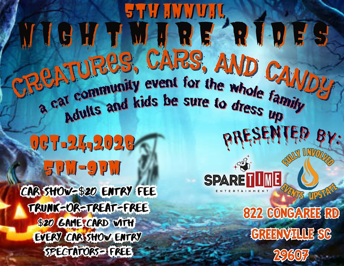 It's time for the 5th Annual Nightmare Rides: Creatures, Cars, and Candy hosted by Fully Involved Events and Spare Time Greenville.