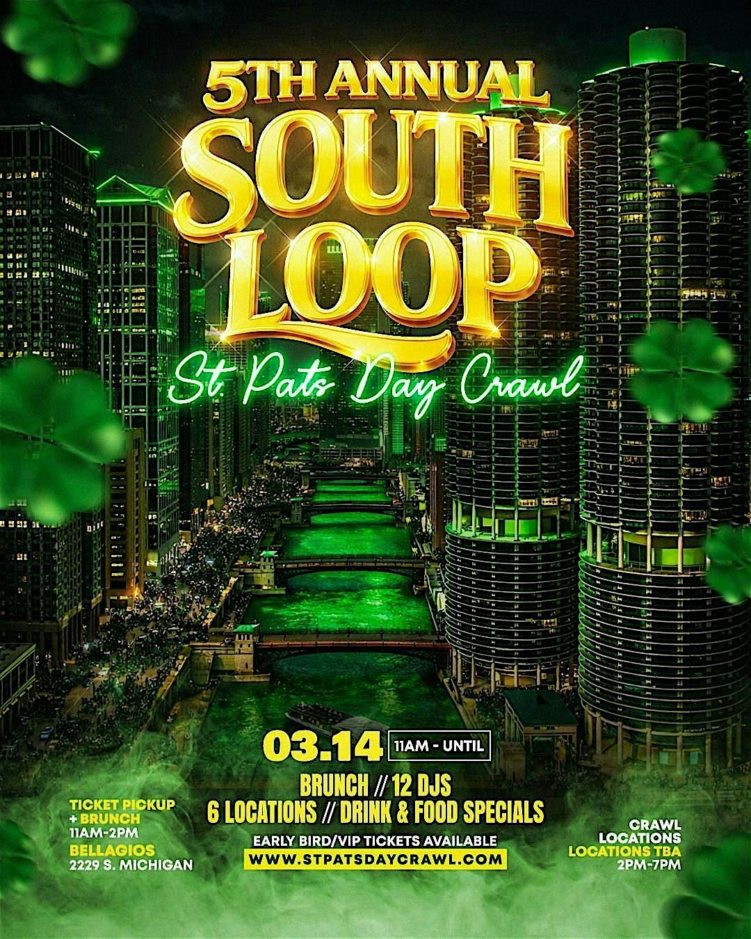Get ready for one of Chicago’s most anticipated St. Patrick’s Day celebrations. The 5th Annual South Loop St. Patrick’s Day Crawl is back with the energy, music, and green you expect. Grab your crew, wear your best green gear, and get ready to crawl. Enjoy nonstop vibes with Chicago’s top DJs, plus exclusive food and drink specials at every participating venue along the route.