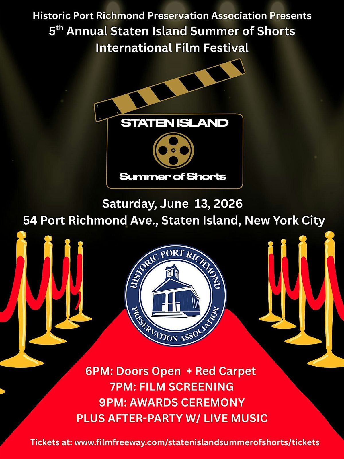 Enjoy a captivating selection of 15 short films, showcasing the talents of filmmakers from Staten Island and around the globe! This exciting event will take place on Saturday, June 13th, 2026, starting at 6 p.m. Prepare for an unforgettable evening filled with a red carpet event, meet-and-greets, movie screenings, and an award ceremony all in one spectacular event. The proceeds from this event will be dedicated to supporting the Historic Port Richmond Preservation Association, a 501c3 non-profit organization.