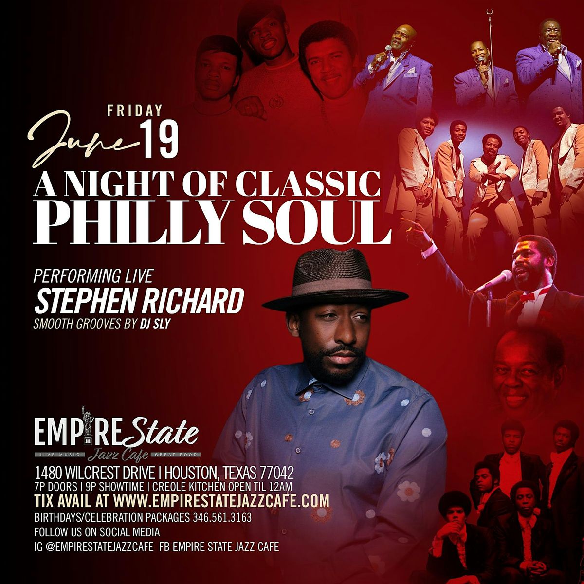 Welcome to 6/19 - Stephen Richard A Night of Philly Soul Friday at Empire State Jazz Cafe! Get ready for a night filled with soulful music and good vibes. Join us on June 19, 2026 at Door 7:00 PM | Show 9:00 PM (Central Time) for a memorable experience. Let's groove to the sounds of Philly Soul and create unforgettable memories together. Don't miss out on this incredible event!