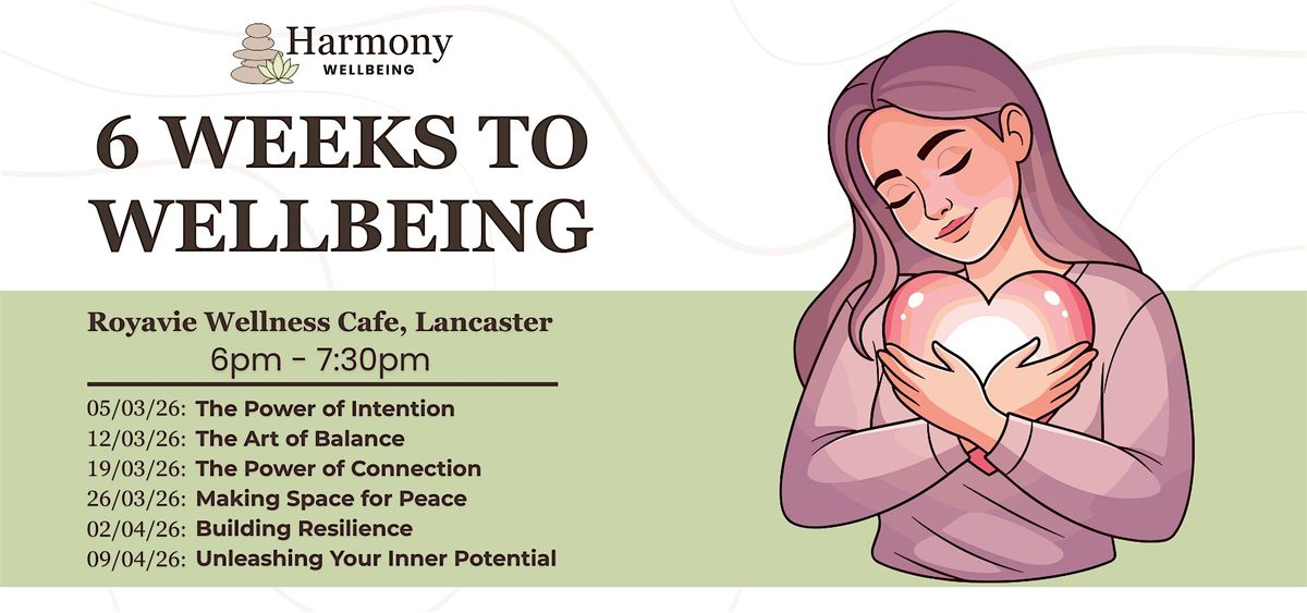Six Thursday evenings of guided wellbeing sessions at Royavie Wellness Cafe in Lancaster. You'll learn practical tools to manage anxiety, reduce stress, and build genuine confidence - all in a supportive, welcoming environment with like-minded people.