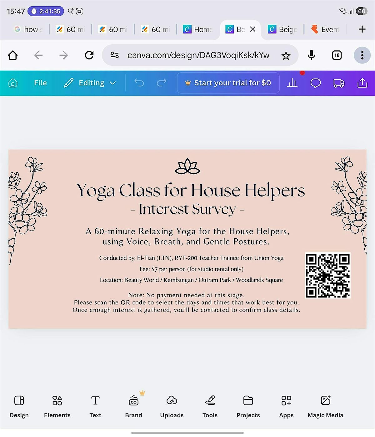 💰 Fee: SGD 7 per session – covers studio rental only. The teacher-trainee does not earn from this event. (Market rate for yoga classes are between SGD 15 - 30 onwards/ 60 min class)