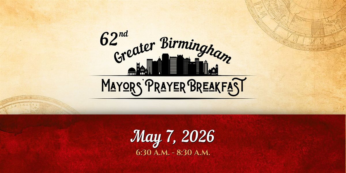 Join us on Thursday, May 7, 2026, at The Harbert Center in Birmingham, Alabama, for the 62nd Annual Greater Birmingham Mayors’ Prayer Breakfast. Community leaders from across the region will gather to seek God together and pray for our families, our cities, and our nation.