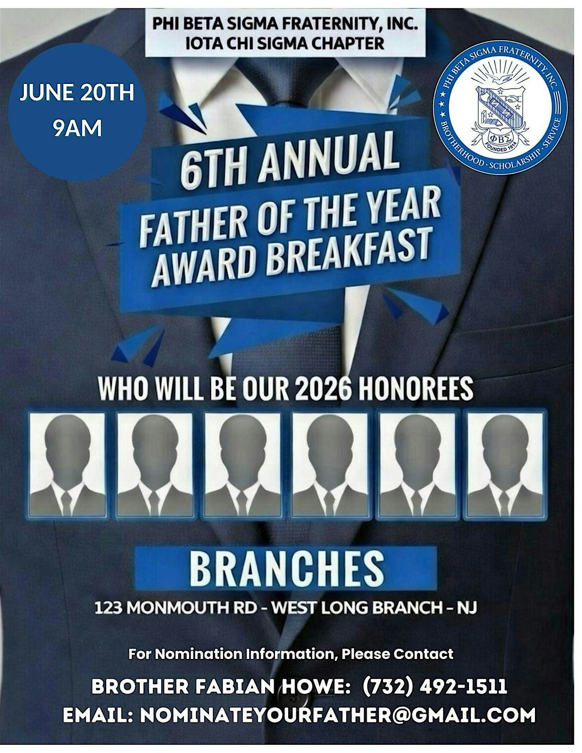Iota Chi Sigma Chapter of Phi Beta Sigma Fraternity, Inc., is hosting its 6th Annual Father Of The Year Award Breakfast! June 20th, 9am - 12pm at newly renovated Branches Catering in West Long Branch, NJ. ***Doors Open/Reception at 8:30am***