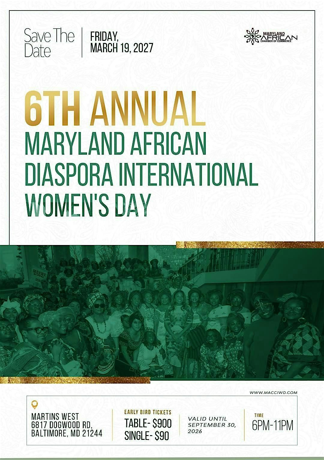 The Maryland African Chamber of Commerce (MACC) is proud to announce that it will host the 6th Annual Maryland African Diaspora International Women’s Day (IWD 2027) celebration on Friday, March 19, 2027. This signature event will honor and celebrate women who are making significant contributions to community development, leadership, and global impact.