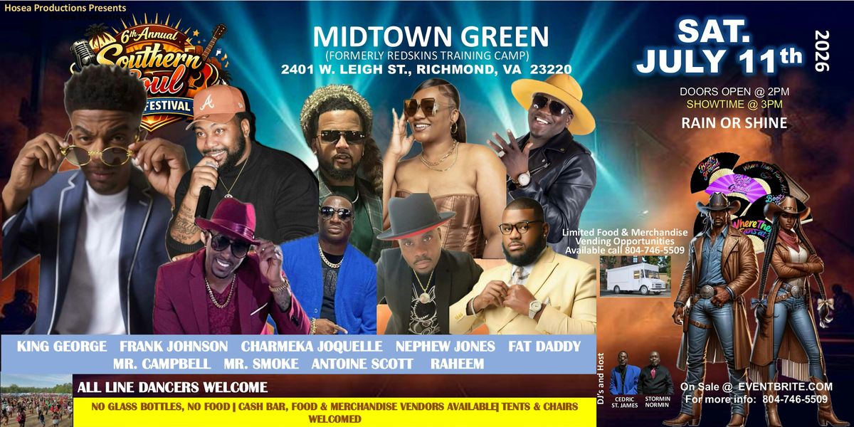 Richmond’s Annual Southern Soul Music Festival featuring King George, Frank Johnson, Charmeka Joquelle, Nephew Jones, Fat Daddy, Mr. Campbell, Mr. Smoke, Raheem and comedian Antoine Scott. Southern Soul originating from a combination of blues, country, and early rock and roll, with a strong gospel influence, Southern Soul was popular in the 1960s and 1970s but has continued to be enjoyed into the present. The concert will be held at Midtown Green, July 11, 2026 gate open @2pm.