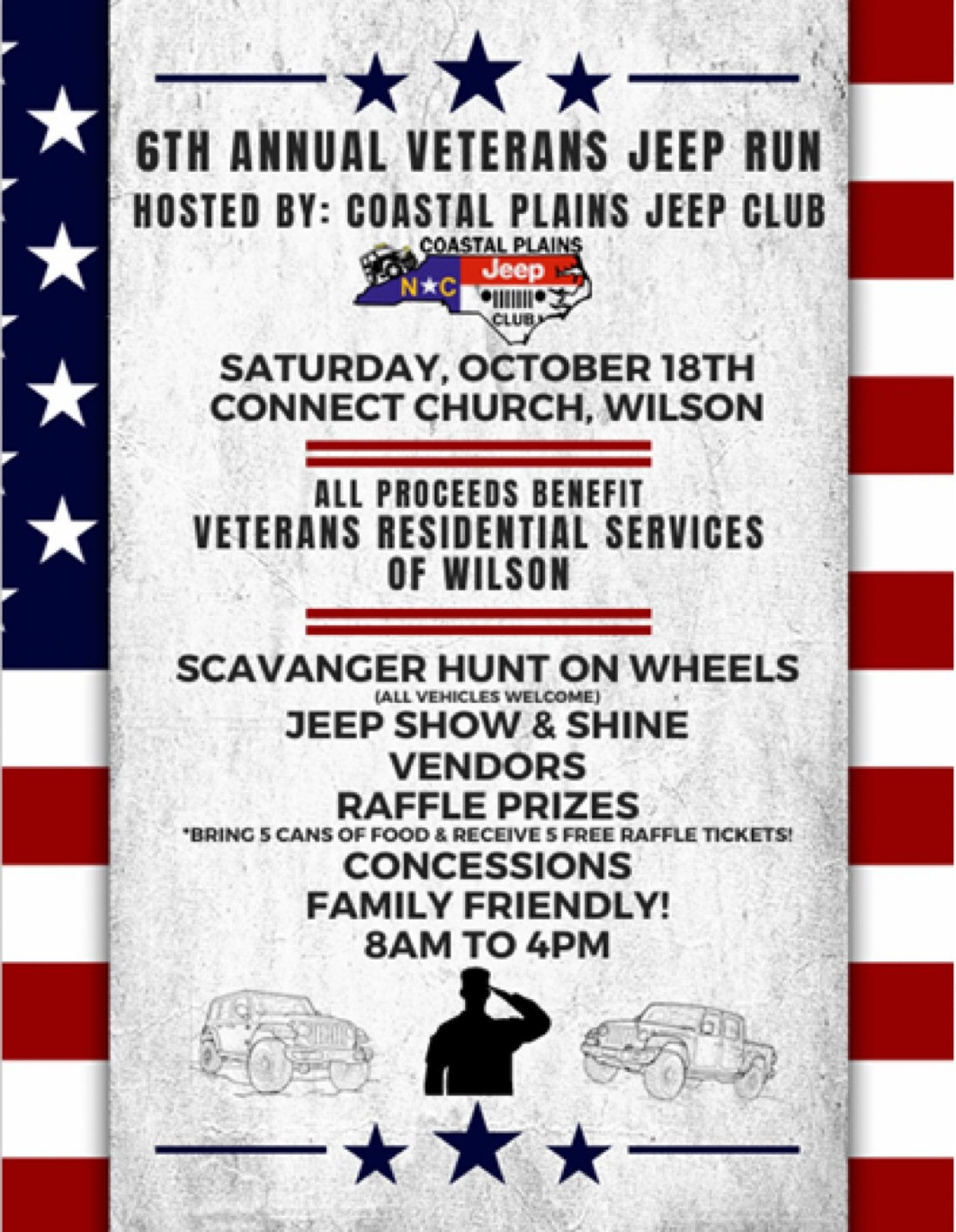 Join Coastal Plains Jeep Club & fellow Jeepers from across North Carolina in raising money for our local Veterans October 18th 2025. We will also be collecting canned food for the Veterans Residential Services food pantry. You can register online via http://www.bigdogsgraphics.com/jeep-run or the day of the event. This year’s event will feature a Scavenger Hunt on Wheels Vendors DJ - Chris Rollins Food Show & Shine and of course Raffles and Silent Auction!Registration & raffle sales will begin at 8AM. T-shirts will be available for pre-order and will be available for pick up with your packets the day of the event.