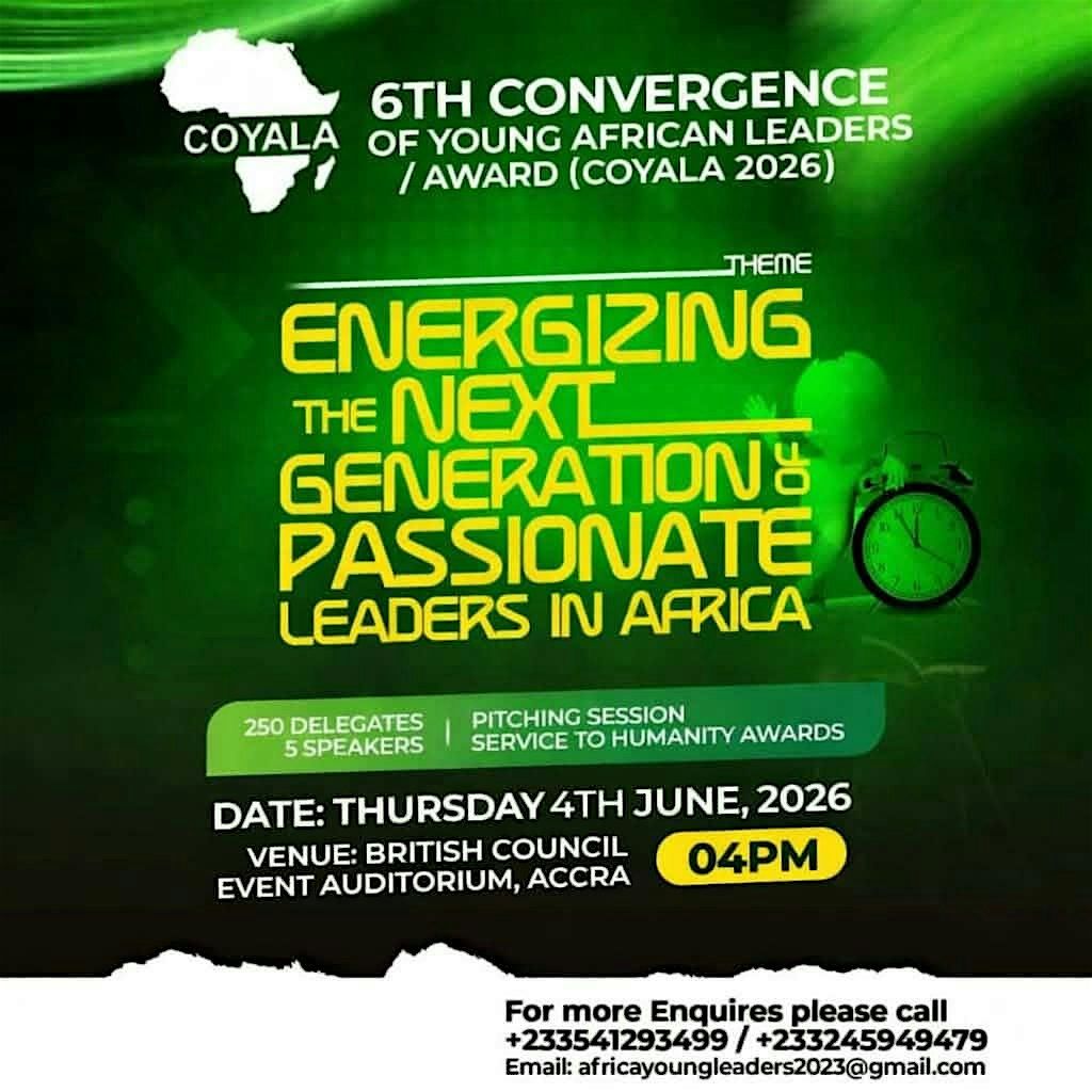 Join us for the 6th Convergence of Young African Leaders/Award (COYALA 2026) at the British Council Event Auditorium, Accra -Ghana! This in-person event takes place on June 4, 2026 at 4:00 PM (GMT). It's a great chance to connect, celebrate, and be inspired by Africa's brightest young leaders. Don't miss out on this exciting gathering full of energy and ideas!