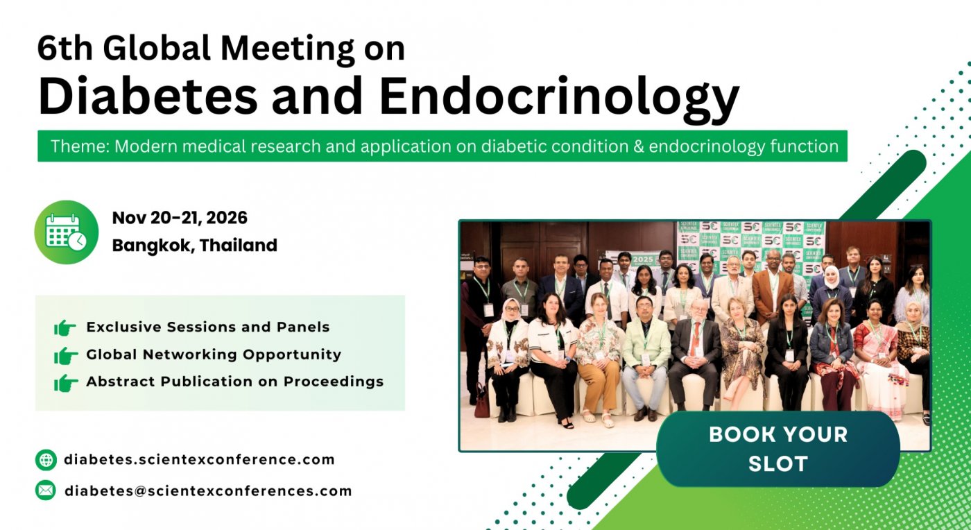 The 6th Global Meeting on Diabetes and Endocrinology 2026 is a premier international medical conference taking place on November 20–21, 2026, in Bangkok, Thailand. This global healthcare event brings together endocrinologists, diabetologists, researchers, clinicians, and industry professionals to discuss the latest advances in diabetes research, endocrine disorders, metabolic diseases, and clinical innovations. The conference features keynote lectures, scientific sessions, oral and poster presentations, and expert panel discussions, offering excellent opportunities for networking, collaboration, and knowledge exchange. Join one of the leading diabetes and endocrinology conferences in 2026 to advance research, education, and clinical practice worldwide.