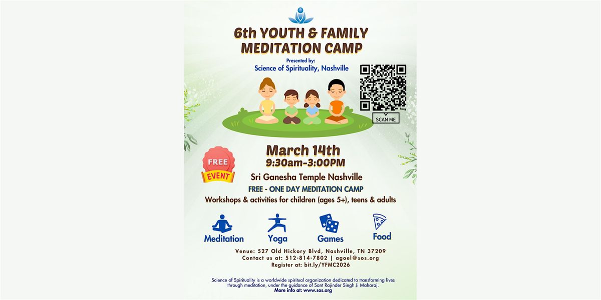 We're so excited to invite you to 6th Youth and Family Meditation Camp (YFMC) on March 14th at Sri Ganesha Temple, Nashville. This is a free camp for all ages(5+), presented by Science of Spirituality. From first-timers to long-time practitioners, this is a chance to step away from the noise and find your center. Join us for a day of joy, peace, and community—we’d love to have you with us!