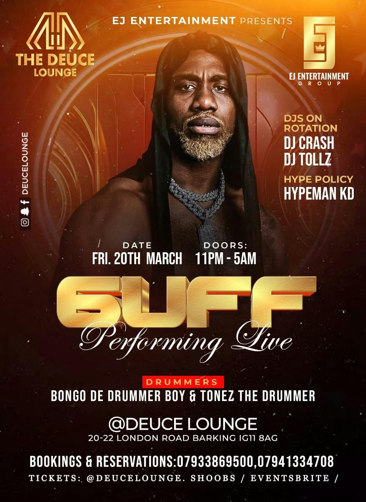 EJ ENTERTAINMENT GROUP Presents ….6UFF LIVE 20th March 2025Time- 10pm to 5amatDEUCE LOUNGE 20-22 london road .Barking .IG11 8AGfor more info and tables contact 07515167770or Dm us @ejents_groupDisclaimer: