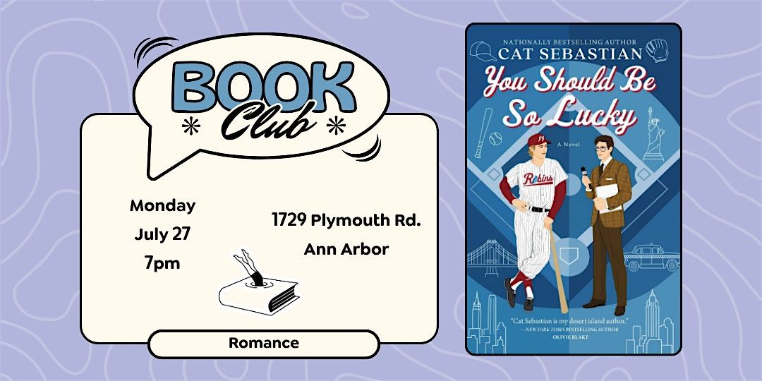 Come join us for a cozy evening at Booksweet for our Romance Book Club on Monday, July 27th! We selected You Should Be So Lucky by Cat Sebastian for our next book. Whether you're an enthusiastic romance fan or just looking for a fun night out with snacks, this event is perfect for anyone who loves a good love story and wants to enjoy some sweet treats!