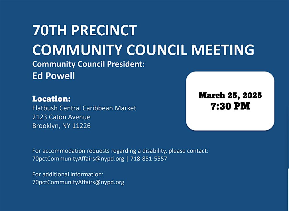 You are cordially invited to join the 70th precinct for the monthly Community Council meeting with the Commanding Officer D.I. Wernersbach on Wednesday March 25, 2026, at 7:30pm.